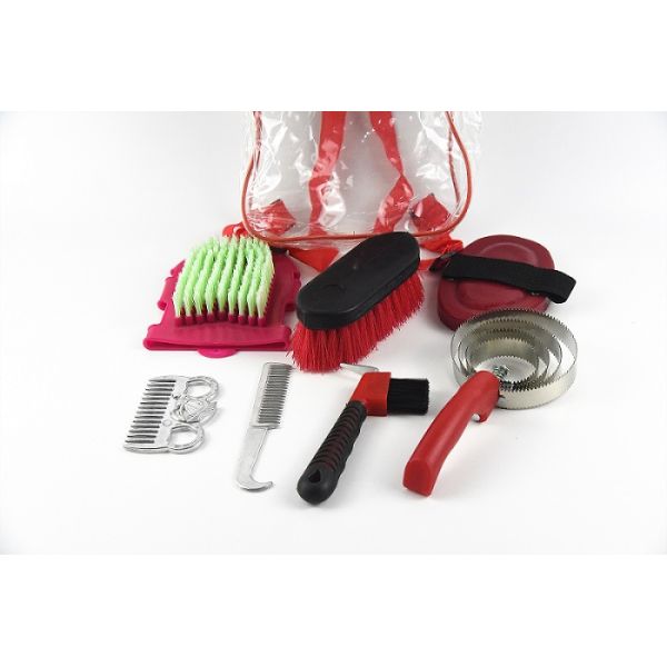 4. Features: There are plastic handle old 6.5 inches two-headed pointed horse grooming brush, large-sized horse massage brush, mesh wrapped horse hoof pick, four circles of stainless steel circular saw, horse head shaped aluminum horse comb, bending hook aluminum comb, old- designed gloves.